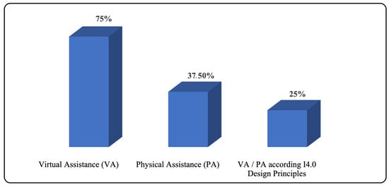 Related to the characteristics of the I4.0 Technical Assistance Design Principle present in VA solutions (RQ1), all the applications present both Physical and Virtual Assistance. The VA applications focus on providing real-time filtered and contextualized information or static information mainly for learning purposes, while Physical Assistance applications are mainly oriented toward performing tasks and helping the user in decision-making. It is possible that Virtual Assistance is more widely spread than Physical Assistance because Virtual Assistance demands only software development with no need for the additional physical components that Physical Assistance needs.