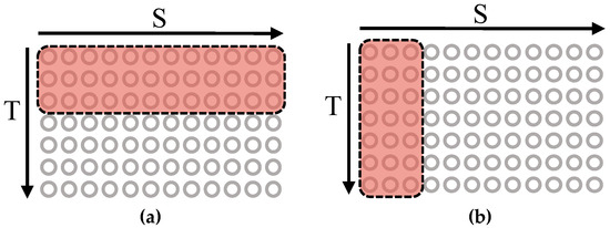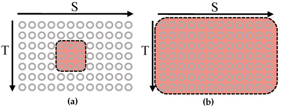 Current GNN-based methods usually use mapping layers [11,12,13], i.e., normal convolutional layers with a receptive field of as shown in Figure 1a, or fully connected layers with a receptive field of in both spatial and temporal dimensions to describe the interactions of each individual with their neighbors. Each circle in Figure 1 represents the feature of the state of an individual action in one frame. The horizontal (S) axis represents the indexes of individuals in the group according to their locations in the x-axis of the image. The vertical (T) axis represents the indexes of the image frames in the group action video clip. The red-shaded area represents the local receptive field centered around an individual for the mapping layer used in the existing methods [11,12,13]. Although these approaches [11,12,13] simplify the computation and reduce the computation cost, they fail to catch the features of global interaction patterns or the influence from all other individuals involved in the group activity.