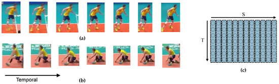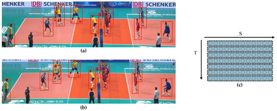 We also introduce constraints to further improve the performance of our network, i.e., global activity consistency and individual action consistency. First, the states of group activity in each frames should be similar to the states in other frames and have similar contribution to the recognition of the group activity. In other words, the features of the states of group activity in each frame in the same event video clip should be similar. The states of the same “set” (or set the ball) group activity in two frames are shown in Figure 3a,b. Since the states of the group activity in each frame should not change too much over time, the features of the states of group activity in each frame should have similar contributions to the recognition of the group activity. As shown in Figure 3c, each row or each grayed area represents a feature of the state of group activity in one frame, and all seven grayed areas should have similar features of the states of the group activity. We call this global activity consistency. Second, each individual action in the video clip should have similar contributions to the recognition of the group activity. Two individual actions in the same “set” group activity are shown in Figure 4a,b. Each corresponding player (each column or grayed area in Figure 4c) in the same video clip should have similar actions or features of individual actions. We call this individual action consistency. The consistency of individual actions also contributes to the recognition of the group activity.
