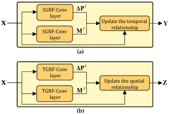 Since each temporal edge has an offset and a weight, each graph corresponds to temporal offsets and temporal weights . As is shown in Figure 7a, to obtain the temporal offset and temporal weight and update the relationship in the temporal dimension, we use two SGRF-Conv layers, i.e., and in S-DCN. The elements of and can be calculated by Equations (3) and (4):