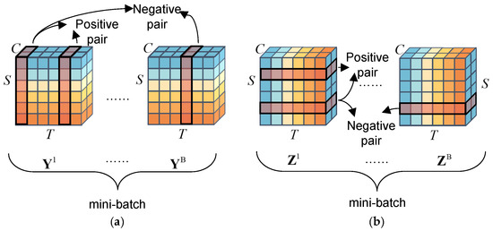 where is a hyperparameter. Specifically, suppose there are B samples in each mini-batch input into GIIN. We denote the feature samples obtained from the S-DCN branches as , where , where represents the feature of the group activity with global interaction information in the spatial dimension of the b-th video in the mini-batch. Then, we slice each , into T slices along the temporal dimension, and denote them as . represents the features of the states of group activity of the b-th sample at the j-th frame. Since is obtained from SGRF-Conv, it provides global interaction information in the spatial dimension. To maximize the consistency of the features of the states of group activity in each frame, we construct positive and negative sample pairs at the training stage. As shown in Figure 8a, we consider the features of the states of group activity learned from the same video as positive sample pairs, and the features of the states of group activity learned from different videos in the same mini-batch as the negative sample pairs.
