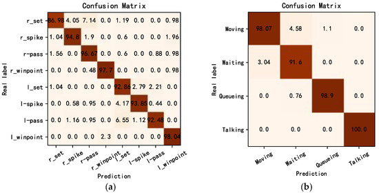 Figure 9a,b show the confusion matrices of our proposed method on the VD and CAD, respectively. As shown in Figure 9a, GIIN achieved over 90% recognition accuracy for all classes on VD except . In particular, the recognition accuracy of GIIN for and exceeded 97%. The above results show that GIIN can well distinguish different activities, especially left and right activities. Misclassified cases were mainly from the samples for , and , which may be because individuals who provide critical clues for these three types of group activities show highly similar actions. As shown in Figure 9b, GIIN achieved over 90% recognition accuracy for all classes on CAD. In particular, the recognition accuracy of GIIN in terms of , and was above 98%. Since the difference between and is the movement of the human body in the temporal dimension, it is important to effectively characterize temporal interactions from a global perspective. The above result suggests that our method achieved accurate recognition by effectively modeling temporal interactions from a global perspective. Our misclassification mainly occurred when identifying and , which most likely resulted from the two types of activities being similar and the temporal dynamic of the samples being too short [17].