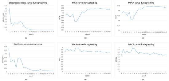 The classification loss curves in training and the classification performance curves in testing. (a,d) are the classification loss curves in training on VD and CAD respectively. (b,c) are the MCA and MPCA curves on VD in testing, while (e,f) are the MCA and MPCA curves on CAD in testing.