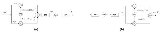 If we consider the RX IQI at the terminal, a high-frequency (HF) signal that is received passes through a bandpass filter (BPF) and enters a low-noise amplifier (LNA), whose function is mainly to increase the output signal-to-noise ratio (SNR) (unlike the PA), so it can be considered linear over the entire operation range, as shown in Figure 1b. To facilitate the illustration of estimating the CSI at the terminal, we use an asymmetric model to describe the received signal in this section [9,24]. Thus, the signal received at the terminal in the time-division duplexing (TDD) system is