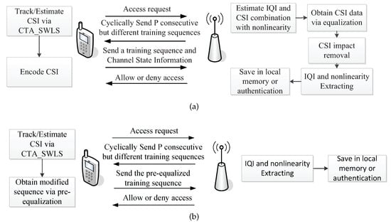 Step 4: The BS estimates the combination of the CSI and transmitter IQI based on the training sequence in step 3 by using the LS or MMSE with PA nonlinearity; then, it demodulates the data, which are also known as the CSI. Followed by the removal of the effect of the CSI in the received signal, the BS then estimates the terminal IQI and PA nonlinearity coefficients. The features are stored in a local database either directly or after processing. It is also possible to compare data in the database by using pattern recognition so that the resulting signal to accept or reject the transmitter’s access can be given.