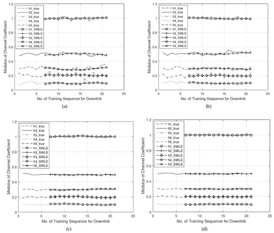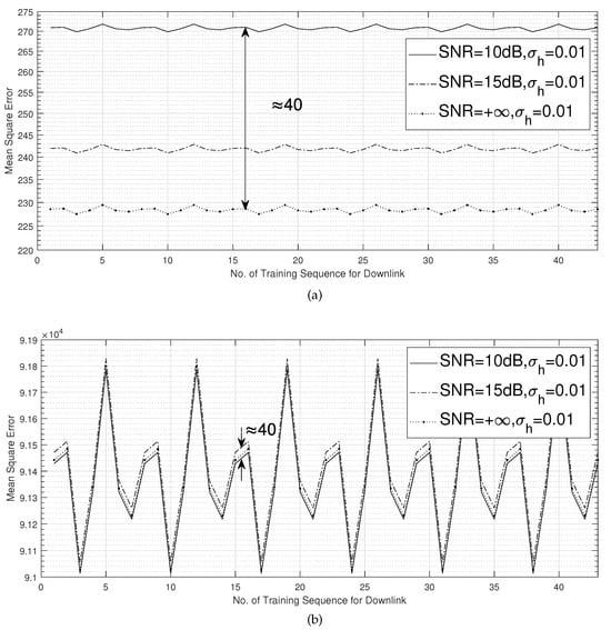 Figure 5 demonstrates the tracking performance of CTA_SWLS according to the MSE. Different noise levels only affected the mean value of the deviation, as shown by, for example, the fixed distance between the two curves at the top and bottom of Figure 5a,b, which was consistent with III in (38). However, the magnitude of the deviation was only affected by the channel jitter, which agreed with I and II in (38). In addition, the curves exhibited a cyclic pattern of the downlink with respect to the number of training sequences due to the cyclical sending of P sequences, which was in agreement with II of (38). Therefore, the theoretical variance of CTA_SWLS given by (38) was confirmed through this simulation.