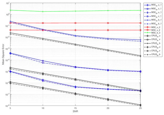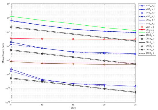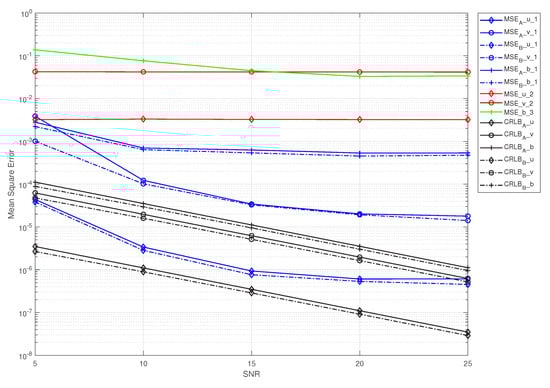 Nevertheless, of all of the scenarios, our proposed scheme was the most efficient among the three methods, i.e., it had a lower MSE and was closer to the CRLB. Another noteworthy aspect is that the MSE curves slowly decreased as the SNR grew, especially in the high-SNR regime. Note that the MSEs in case B were slightly lower than those in case A, especially with a low SNR, which verified the conclusion given in Section 4. This is because when the CSI was estimated, it was placed at the transmitter to directly remove the effect of the CSI on the system; then, the signal without the impact of the CSI was transmitted, i.e., case B. On the contrary, the CSI was further distorted in transmission, resulting in the removal of the impact of the CSI on the system at the receiver, thus making the error of the system larger, i.e., case A.