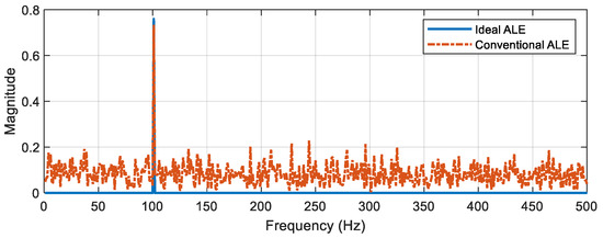 In practical applications, it is hoped that the frequency response of ALE can further approximate the ideal situation. Figure 2 shows the comparison of frequency response between the ideal ALE and the conventional ALE, in which the simulated line frequency is 100 Hz. Although the conventional ALE has been able to suppress noise, it is still far from the ideal sparse model and can be optimized. Therefore, the SNR of lines can be further improved by making the ALE frequency response sparser.