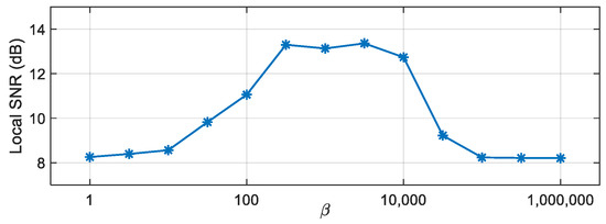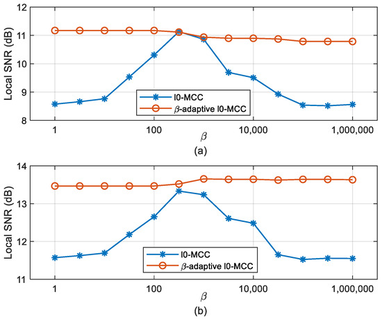 The sensitivity of β was also analyzed. β was set to a wide range, from 1 to 106. The local SNR of ALE output under different values of β is compared, and the results are shown in Figure 7. The performance of l0-MCC-ALE drops close to 6 dB when β is too large or too small, but β-adaptive l0-MCC-ALE always maintains good performance. The simulation results show that β-adaptive l0-MCC-ALE effectively reduces the sensitivity of parameter β, which makes the implementation of the ALE simpler and more reliable.