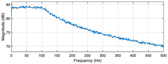 The simulated received signal contains two ultra-low frequency lines of 14 Hz and 27 Hz, and the simulated ocean ambient noise is added [26]. Within 100 Hz, the background noise is flat, and beyond 100 Hz, it declines at a rate of 6 dB/oct. The spectrum of the noise is shown in Figure 5, which is a Gaussian-colored noise. The input SNR of the signal is expressed using the spectral level SNR, which is the ratio of the power of the line to the average noise power in the 1 Hz bandwidth. Compared with traditional wideband SNR, spectrum-level SNR can accurately measure the power of the line relative to its local bandwidth noise. In the simulation, the spectrum level SNR of each line was set as −5 dB, the signal sampling rate was 512 Hz, and the duration was 300 s. The ALE order L was 4096, the delay Δ was 100, and the step size μ was 10−5. The parameters of the l0-MCC algorithm were set to σ = 0.5, ρ = 10−9, β = 500, respectively.