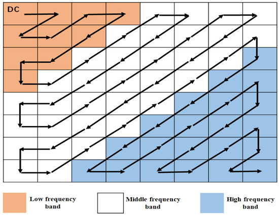 DCT can be performed on the entire image or used on selected blocks. The matrix after DCT is shown in Figure 1, the first coefficient in the upper left corner of the matrix is a DC coefficient, and the others are AC coefficients. The matrix is divided into three parts in zig-zag order: low, medium, and high frequency. The low frequency contains the main information of the image and has the greatest impact on the image, while the high frequency contains a small amount of image information and has little impact on the image. Therefore, considering the balance of robustness and imperceptibility, the watermark is generally embedded into the medium frequency coefficients.
