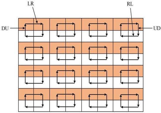 Selection of inter-block adjacency: The adjacency used in [14] is UD, where each DCT block is the block in the next row. The selected adjacency in [15] is LR and RL (right to left), and the selection of a UD block is used for the connecting part of two rows; please refer to the location indicated by RD and LD in Figure 2. The selected adjacencies in [16] are LR, UD, RL, and DU (down to up), as shown in Figure 3. A 16 × 16 block is divided into four 8×8 sub-blocks to fully consider the correlation between image blocks. The rules of adjacency selection used in this paper also follow the rules in [16].