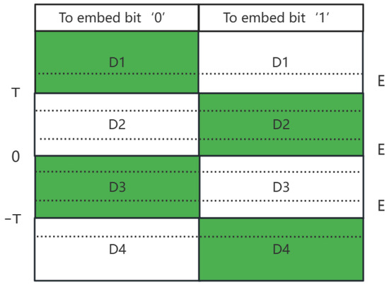 Selection of difference regions: The difference partition in [15,16] is set to five regions; watermark bits are embedded in different regions. It can be concluded that Region 3 is not used for embedding. The difference between the coefficients of the same position of adjacent blocks is very small. Thus, most of the difference is within Region 3. This means that all differences need to be modified, and increasing the number and amount of difference offsets will reduce the robustness of the watermark. As a result, the proposed method reduces the difference regions to four, and embeds watermark bits into Region 1, 3 and Region 2, 4, which can reduce the number and the value of offsets and improve the robustness of the watermarking. The rule of partitioning is shown in Figure 4.