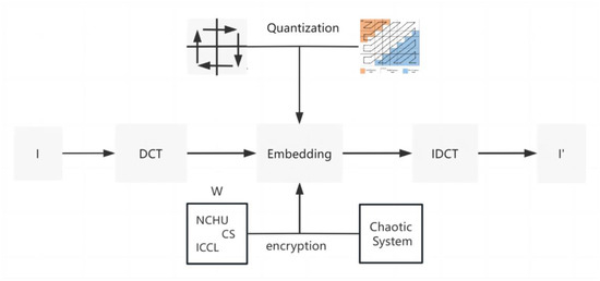 For the overall embedding framework of the watermark, the overall steps are shown in the following Figure 5: I represents the original image, W represents the binary watermark image, and I’ represents the embedded watermark image. The quantization and encryption methods used for embedding have been discussed in the previous text.