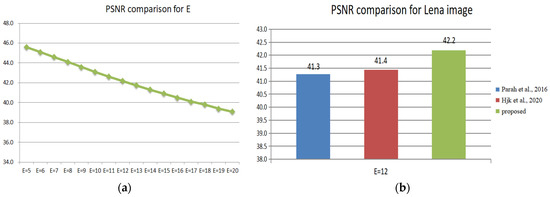 PSNR comparison of Lena watermark images under different values of E. (a) PSNR under different values of E using proposed method; (b) PSNR under different methods using the same values of E [15,16].