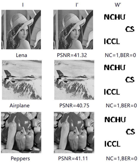 The I, I′, and W′ in Figure 7 represent the original image, watermark image, extracted binary watermark, and corresponding PSNR, NC, and BER, respectively. It indicates that the watermark can be extracted losslessly without attack.