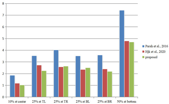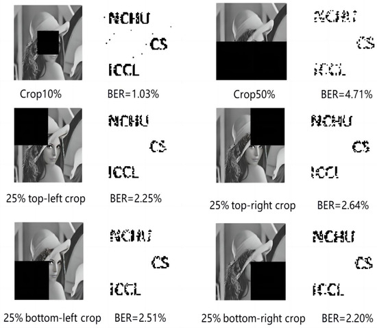Figure 8 shows an image with a 10% crop in the center; the BER of the extracted watermark is 1.03%. Figure 8 shows the Lena image with 25% cropping of the image (in different regions: top left, top right, bottom left, bottom right) with an average BER of 2.40%. It also shows the Lena image with 50% bottom crop and a BER of 4.71% for the extracted watermark. The results of the cropping attack experiments show that the method can extract the watermark under a cropping attack, and the robustness of the proposed method is compared with robustness under a cropping attack (Lena image) proposed in schemes [15,16] and shown in Figure 9; the proposed method has a lower BER of about 36% compared to scheme [15] and about 4.4% compared to scheme [16].