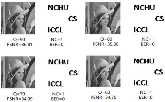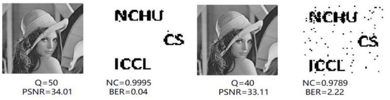 JPEG is a standard compression technique used to minimize image storage requirements and to reduce the bandwidth required for transmission. In our work, we use JPEG compression for the watermarked Lena image with different quality factors (Q = 90 to 40). In methods [15,16], they have changed the offset threshold E = 12 to E = 20 in the process of embedding in order to increase the robustness under JPEG attack and reduce the invisibility of the watermarked image. Our experiment also performs a JPEG attack with E = 20 and outperforms the previous schemes in terms of PSNR, NC, and BER. As Figure 10 shows, when the JPEG compression quality factor Q is at 90 to 60, the proposed scheme can extract binary watermarking without loss with NC = 1 and BER = 0. As shown in Figure 11, our method can still extract watermarks when the Q values are 50 and 40.