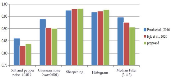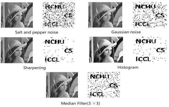 The proposed method was tested via noise addition, sharpening, histogram equalization, and median filtering. The detailed results for the various attacks are listed as shown in Figure 12.