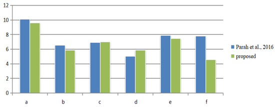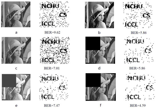 BER comparison with various combined attacks. (a): salt and pepper noise and median filter; (b) histogram equalization, sharpening and scaling; (c) histogram equalization and scaling; (d) degree rotation and crop by 25% on the left; (e) 5-degree rotation, 25% crop on the upper left, and histogram equalization; (f) 5-degree rotation, upper left 25% crop, and sharpening [15].
