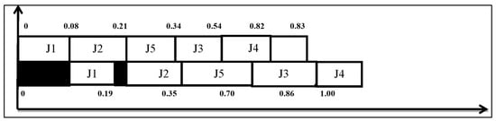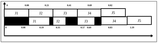 The burst time of every work is allocated across the two machines in the FCFS algorithm. As indicated in Table 3, the jobs that are in the ready queues of both servers are carried out in accordance with their IN–OUT times (FCFS method). Table 4 shows that task J1 begins execution on machine 1 and ends on machine 2 with an INTIME of 0 ms and OUTTIME of 0.08 ms, respectively. When task J1 finishes running on machine 1, it begins running on machine 2 between 0.08 and 0.19 ms later. Similarly, all tasks are executed in a similar fashion. Equations (1) and (2) are used to determine the mean service time in this instance of the FCFS scheduling method utilizing two machines. The mean service time and the average service rate may then be estimated once we determine the service time of each process, which can be discovered using the Figure 5 Gantt chart. Here, we see that the execution times for tasks J1 to J5 ranged from 0 to 1.19 ms, which is comparably greater as compared to the DJS method. The findings are computed using Equations (1)–(8), and the results are described in Table 5, Table 6, Table 7, Table 8, Table 9, Table 10 and Table 11 [47].