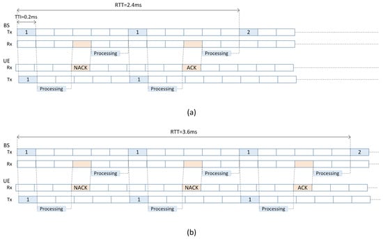 Figure 1a and Figure 1b respectively depict the downlink transmission process of a retransmission and double retransmission in a normal HARQ. Assuming the transmission time interval (TTI) is 0.2 ms, the RTT through the 5G HARQ to complete a retransmission and double retransmission is 2.4 ms and 3.6 ms, respectively. Note that here, the UE is sent with a negative time offset relative to the base station (BS) based on the final timing-advance (TA) settings. After the TX sends the data, physical forward error correction (FEC) reduces the number of retransmissions by adding redundant information so that the RX can correct some of the errors. For errors that cannot be corrected by forward error correction, the RX requests the sender to resend the data through the SW_ARQ mechanism. The RX employs an error detection code, typically a cyclic redundancy check (CRC), to detect whether the received packet is wrong. If there is no error, the RX will send a positive ACK to the sender, and the TX will process this and send the next packet upon receiving the ACK. If an error occurs, the RX drops the packet and sends a NACK to the TX. Subsequently, the TX retransmits the same data in turn after receiving the NACK.
