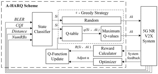 The objective of the A-HARQ mechanism is to select the appropriate transmission scheme for each packet to reduce the entire retransmission in the 5G NR-V2X physical layer. The objective of Q-learning in the A-HARQ employs a learning model to choose the optimal scheme that can reduce the average BLER across various transmission environments.