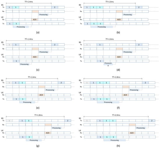 T-delay scheme where T = 1 slot (a) and T = 2 slots; (b) K-repetition scheme where K = 1 (c) and K = 2 (d); [T, K]-overlap scheme of T-delay and K-repetition where [T, K] = [1, 1] (e), [T, K] = [1, 2] (f), [T, K] = [2, 1] (g), and [T, K] = [2, 1] (h).