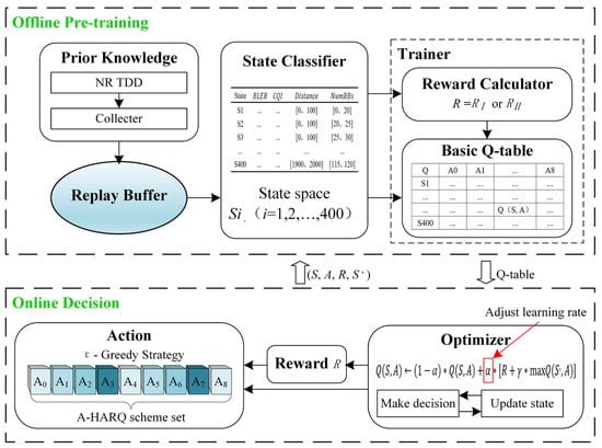 Referring to the study by [23], we adapt it as our asynchronous framework for the proposed A-HARQ architecture. Figure 4 illustrates the two primary stages: offline training and online decision making. From a global perspective, they operate on the same Q-Table. The offline training stage aims at building a basic Q-Table to provide support for the online decision stage. The offline training process is completed in advance, and its outcomes are compiled into the MATLAB logging file. The online decision stage focuses on both the processes of making the decision on what action will be performed and updating the Q-Table to help improve future decisions.