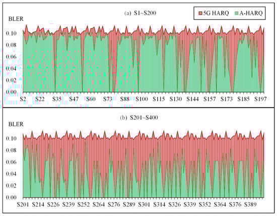 Based on our design, the selection of transmission scheme (A1–A8) is used in the case that the transmission fails to meet the BLER requirements, while the transmission scheme of the original 5G HARQ (A0) is used for cases that meet the BLER requirement. Therefore, it is possible to initially set the maximum tolerable BLER threshold, denoted as , which can be adjusted as necessary. In our observation, the BLER threshold is set as in the simulation environment.