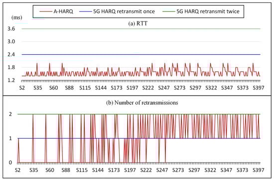 Figure 8 depicts the performance comparison of RTT and retransmission times between the A-HARQ scheme and the HARQ scheme. The simulation results demonstrate that that the A-HARQ scheme enables a reduction in the RTT and retransmission instances compared with the HARQ scheme, as shown in Figure 8. The final RTT is shortened by 35.23% and 56.82%, respectively, on average, i.e., from 2.4 ms and 3.6 ms to 1.55 ms, respectively. The average reduction in the number of retransmissions is 2.31% and 51.16% for the first and second cases, respectively. Specifically, the number of retransmissions decreased from 1 to 0.97 for the first case, and from 2 to 0.97 for the second case.
