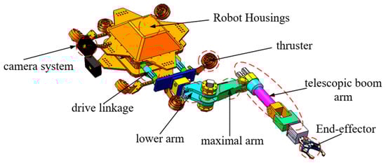 The underwater telescopic arm robot studied in this paper consists of three main components, namely the drive component, the actuation component, and the cruise component. The actuator assembly designed in this paper is mainly tasked with searching for multi-targeted dispersions and assisting the robot in completing assembly. It consists of a multi-dimensional integrated actuator with a large arm, a small arm, and a telescopic rod arm. Drive components include a drive linkage and six gimbaled thrusters that form a stabilized drive for the telescopic boom throughout the cruising range and reducing unnecessary wear and tear. The cruise component includes the machine’s thermal self-housing and a camera system to further capture the cruise environment, which ensure the stability of the entire underwater telescopic arm robot to accomplish trajectory localization. The designed robot model is shown in Figure 1.