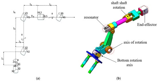 In this paper, the telescopic arm of the designed underwater telescopic arm robot is studied, and its structure is schematically shown in Figure 3b. The telescopic arm shown in Figure 3b is a six-degree-of-freedom robotic arm consisting of six free joints and telescopic rod joints. The three main components of the entire telescopic arm are the big arm in the drive joint, the small arm in the activation pivot, and the telescopic pole arm for search and arrest. The entire arm can be positioned in three dimensions. Three rotating pairs of axle shafts, the bottom shaft and the shaft, respectively, regulate the oscillation of the big arm, the small arm, and the telescopic rod arm joints. The resonator is located at the end of the telescopic boom arm to detect the amplitude of the vibration of the telescopic boom arm approaching the target. The entire robotic arm follows the principle of the positive inverse solution of motion. The D-H parametric method is a method proposed by Denavit and Hartenbery to form the connecting rod into an intrinsic coordinate system. As shown in Figure 3a, one should build the D-H parameter motion axis to establish the motion coordinate system through kinematic analysis, in order to obtain the kinematic positive solution, reflecting the rigor and efficiency of the full-text design.