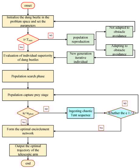 Step 1: Use kinematics to build a telescopic arm model and solve the parameter values to establish a 5-5-5 polynomial trajectory planning path. Step 2: Initialize the original population of dung beetle in the problem space and set the parameters. Step 3: Eliminate some of the native populations according to the winning strategy, and give priority to the selection of the new generation of iterative individuals who adapt to obstacle avoidance in population reproduction. Step 4: The iterative evaluation of excellent individuals for population search and population capture prey stage to find the optimal prey direction. Step 5: Ingest a chaotic Tent sequence for global search to form the optimal bounding network. Step 6: Find the optimal individual and output the optimal trajectory of the telescopic arm. |