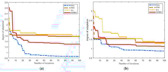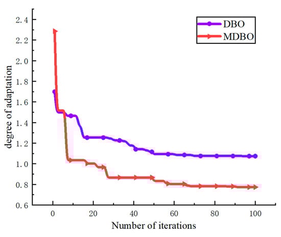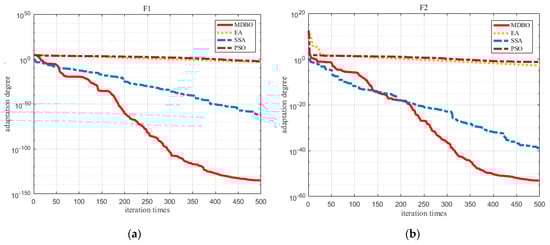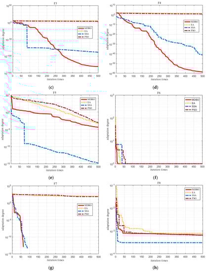 According to the analysis shown in Table 4, it is observed that the average value of MDBO is theoretically optimal for unimodal functions –. The standard deviation is close to 0. In the unimodal function , the average value of the MDBO algorithm is more advanced, and the standard deviation is also maintained at 0. It can be inferred that the MDBO algorithm has stronger insight and search ability in the optimization test process. In the test verification of the multimodal function –, the average value of the MDBO algorithm is still close to the theoretical optimal value and the standard deviation is 0. It shows that the optimization results of multiple test experiments are consistent. Therefore, the MDBO algorithm which we designed has a strong optimization ability and adaptability, and we can achieve local optimization of multimodal functions at multiple extreme points. The test convergence curve of – is shown in Figure 9.