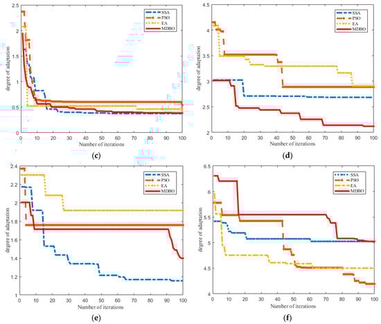 In order to further clarify the performance difference between the MDBO algorithm proposed in this study and other algorithms (such as PSO, EA, SSA), this paper sets the initial population number of particle swarm optimization (PSO), differential evolution algorithm (EA), and sparrow algorithm (SSA). Consistent improvements to the safety threshold, unification of the maximum number of iterations to 100, and the fitness curves of the six joints of the telescopic arm for different algorithms are shown in Figure 11.