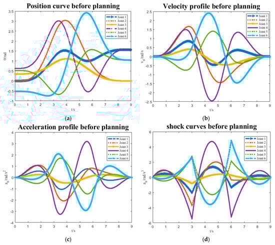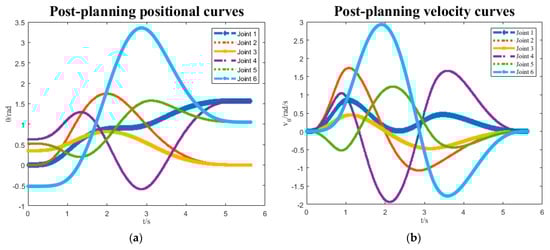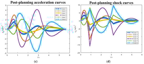 In order to verify the effectiveness and superiority of the improved dung beetle algorithm applied to the telescopic arm to reduce obstacle avoidance and path optimization, the trajectory tracking of the same target is carried out. The joint parameters of the manipulator before and after optimization are shown in Figure 12 and Figure 13.