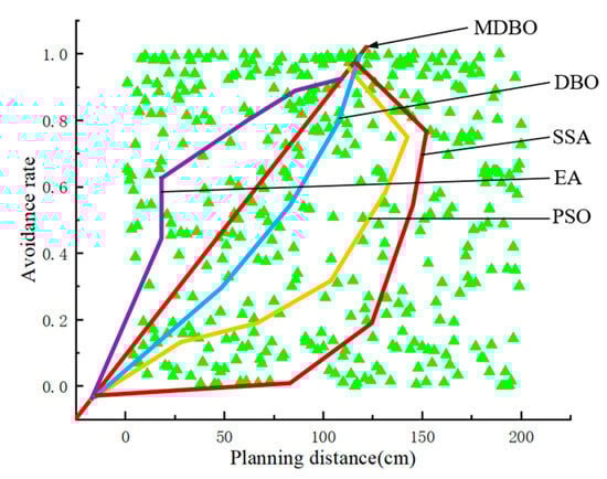 Based on the five algorithms, the telescopic arm trajectory completed under the planning distance of 200 cm is shown in Figure 14. The MDBO algorithm has the shortest optimal trajectory planning path, and the obstacle avoidance efficiency is better than other algorithms, which fully reflects the comprehensiveness of the MDBO algorithm.