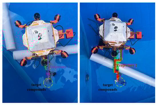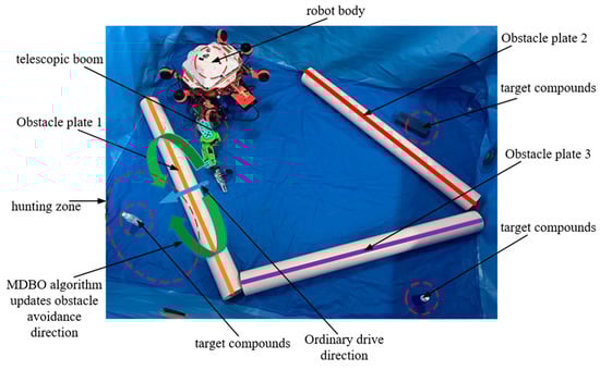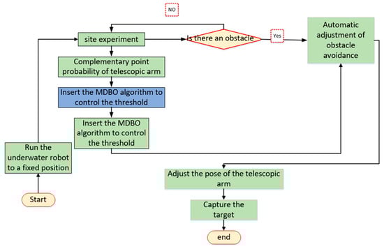 In view of the particularity of the underwater environment, we set the water depth to 18 cm to ensure that the speed of the water and external interference is negligible. We have taken pilot tests on the telescopic arm input many times first. Preliminary data on the probability of a retractable arm avoiding a patch point indicate effective regulation by inserting the MDBO algorithm to form the entire effective telescopic arm to search the trajectory obstacle blind zone (Algorithm 2). Thus, automatic and effective obstacle avoidance is realized, and the obstacle avoidance flowchart of the experimental algorithm is shown in Figure 16.