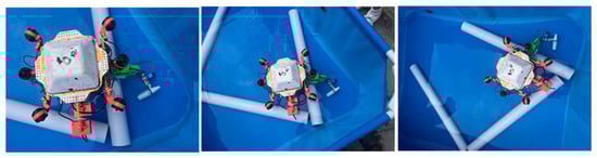 In this paper, the underwater target grabbing test is designed to use the propulsion force of the underwater robot’s own servo motors, thereby sending the underwater telescopic arm robot closer to the target to reach the telescopic arm’s executable search range. The MDBO algorithm is applied to activate the telescopic arm input for the input program and the output to control the telescopic arm to execute the capture command. By setting up obstacle plates 1, 2, 3 to increase the obstacles for the trajectory planning of the telescopic arm, and placing the target at the designated location for the underwater experiment, the setup of the underwater experiment environment is shown in Figure 15. This experimental environment is a preset environment, and the whole state belongs to the waterless state.
