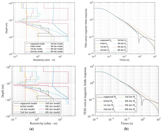 When inversion is performed using the traditional gradient class method [15,51] when the initial geoelectric structure is a uniform half-space model, it is difficult to find the geoelectric structure that makes the TEM signal appear in the wrong direction (Figure 1a) during the inversion process, and the predicted geoelectric structure cannot be close to the preset structure (Figure 1b). The optimization process is stalled.