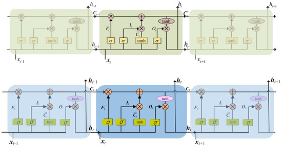 where xt symbolizes the input to the LSTM model during time step t, while ht−1 denotes the preceding time step’s output from the recurrent hidden layer, and b denotes bias coefficients. Wf, Wi, Wo, Wc correspond to the weight matrices associated with F, I, O, and C, respectively.