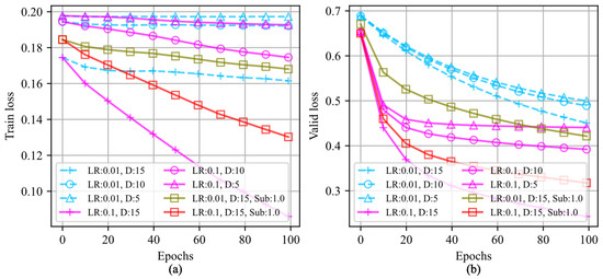 Training processes of the proposed neural networks correspond to different learning rates, network depths, and regularization rates. (a) represents the training loss decay; (b) represents the loss decay of valid dataset.