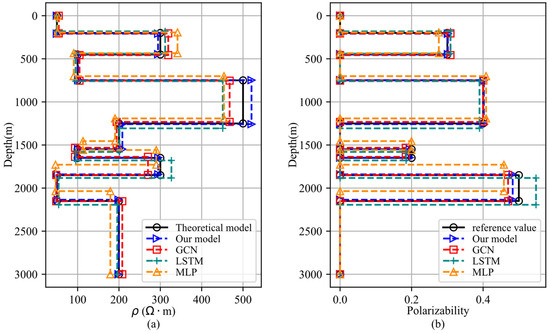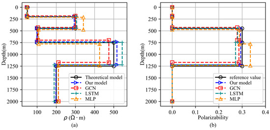 The accuracy of parameter predictions for the geoelectric model by different neural networks ranks from high to low as follows: our proposed model, GCN, LSTM, and MLP (Figure 7a). The inaccuracies in the geoelectric structure primarily concentrate on high-resistance layers, specifically layers with resistivities of 300 Ω·m and 500 Ω·m. In layers containing induced polarization effects, the accuracy of predicting the third-layer IP parameters generally surpasses that of predicting the fourth-layer IP parameters.