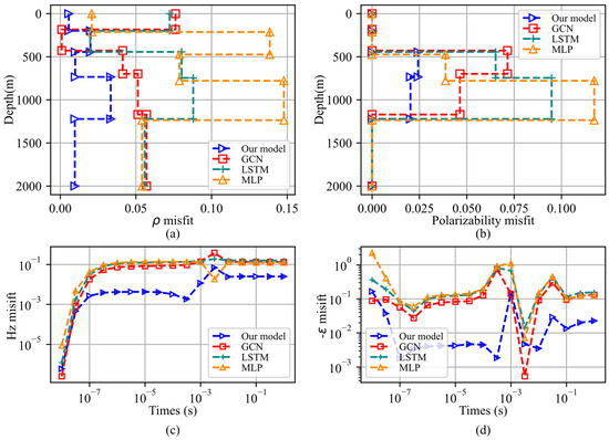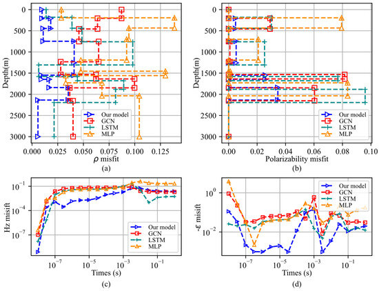Taking into account the comprehensive comparison of the misfits of various neural networks in predicting geoelectric model parameters (Figure 9a,b), their prediction accuracy from high to low ranks is as follows: our model, GCN, LSTM, and MLP. The intervals with larger error values are primarily concentrated in high-resistivity layers, particularly for layers with resistivity values of 500 Ω·m and 300 Ω·m. For layers with induced polarization effects, MLP’s predictions show significant inaccuracies. LSTM starts exhibiting noticeable misfits from the fourth layer onwards.