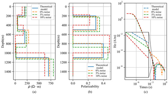 To assess the stability and generalization ability of the proposed neural network for inverting TEM data with consideration of IP effects, we designed a case study involving a noisy 5-layer geoelectric model. Gaussian random noise at levels of 5% and 10% was added to the TEM responses of a five-layer geoelectric model, with a noise-free case serving as the reference. The resistivity values for the five layers of the geoelectric model were set as follows: ρ1 = 300 Ω·m, ρ2 = 200 Ω·m, ρ3 = 500 Ω·m, ρ4 = 50 Ω·m and ρ5 = 1000 Ω·m. The corresponding layer thicknesses were h1 = 200 m, h2 = 300 m, h3 = 300 m and h4 = 300 m. We considered a simple excitation polarization effect with variations only in the “m” coefficient, where the m values for the second and fourth layers were set to 0.3 and 0.4, respectively.