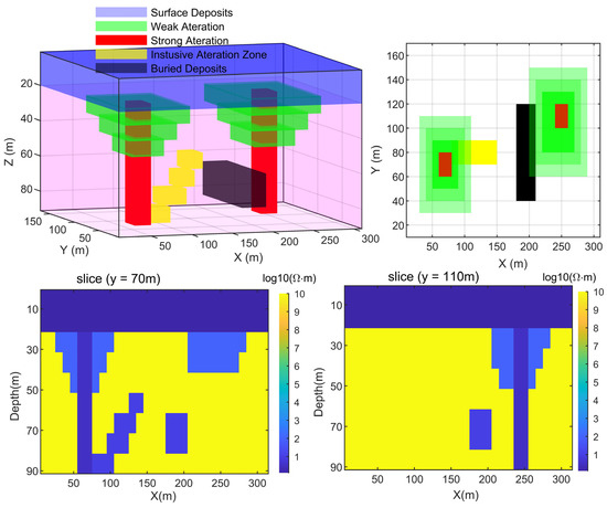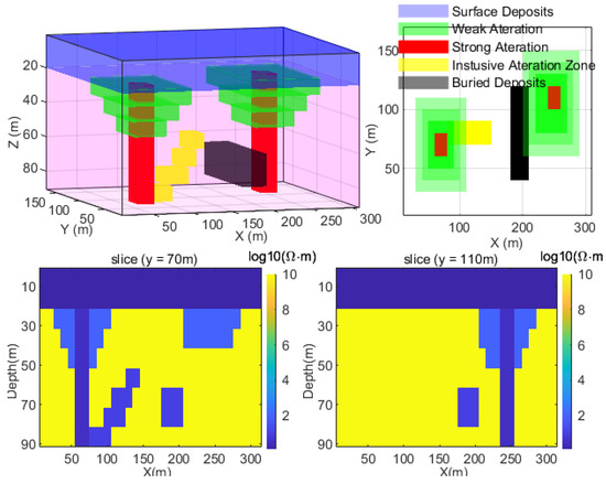 To further validate the network’s capability to handle complex geoelectric structures, a 3D simulation model of a seafloor massive sulfide (SMS) deposit has been established. The resistivity of the overlying layer of minerals is set to 10 Ω·m. As magmatic-hydrothermal upwelling occurs, alteration zones gradually form around the upwelling channels, resulting in electrical resistivities of 0.5, 1, and 2 Ω·m, corresponding to strong, medium, and weak alteration regions, respectively. In the intermediate region between two magmatic-hydrothermal upwelling channels, there exists an alteration zone (depicted in yellow) that does not make direct contact with the seafloor surface alongside a buried, intact sulfide sedimentary mineral deposit (depicted in black). Figure 11 displays a perspective view, top view, and sliced view of this 3D model.