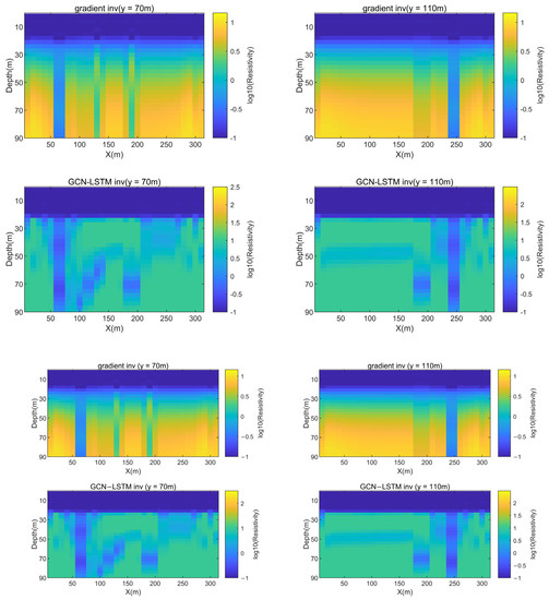 The inversion results of the proposed method are compared with those of the traditional gradient inversion method, as illustrated in Figure 12. The traditional gradient inversion method employs OCCAM inversion [51], and the specific implementation and inversion termination strategy are referenced from the literature. Due to the absence of a strategy for optimizing polarization parameters, the inversion results at y = 70 m and y = 110 m in the gradient inversion show an inability to accurately recover the predefined geoelectric structure of SMS. In contrast, the inversion slices obtained using the proposed method demonstrate an effective characterization of the fundamental geoelectric structural features of magmatic-hydrothermal upwelling channels, alteration regions, and buried SMS minerals. This underscores that the TEM inversion framework based on the GCN-LSTM neural network can effectively account for the induced polarization effect in electrical media while achieving accurate geoelectric structure reconstructions.