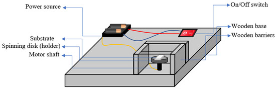 Spin coating is a widely used and highly effective technique for depositing thin films. One of the key advantages of this technique is its simplicity, which makes it a popular choice in laboratory settings [21]. It involves depositing a liquid precursor solution onto a substrate and then spinning the substrate at high speeds to produce a thin film with uniform thickness. The resulting films are of high quality and exhibit excellent surface coverage, which makes them ideal for a wide range of applications [21]. However, one of the disadvantages of spin coating is its cost. The equipment required for spin coating can be expensive, which makes it challenging for some researchers to adopt this technique. For this, we use simple and cost-effective setups to perform spin coating and prepare our films. This simple device involves spinning the substrate using a DC motor. The substrate was fixed to the holder by putting it on top of the motor.