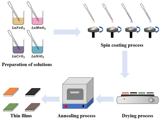 Schematic diagram showing the preparation procedure of LaXO3 (X = Fe, Mn, Cr, Ni) thin films using spin coating technique.